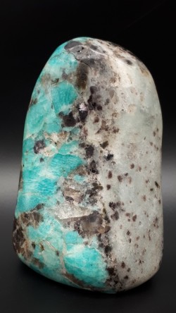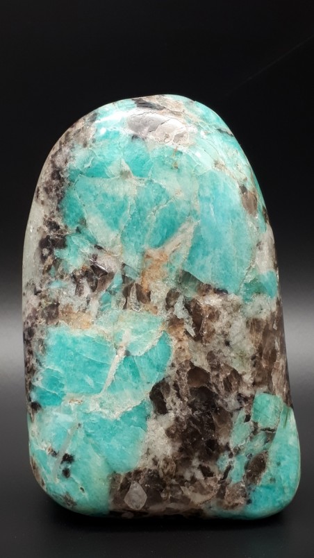 Forme libre d'amazonite avec quartz fumé naturels de Madagascar.